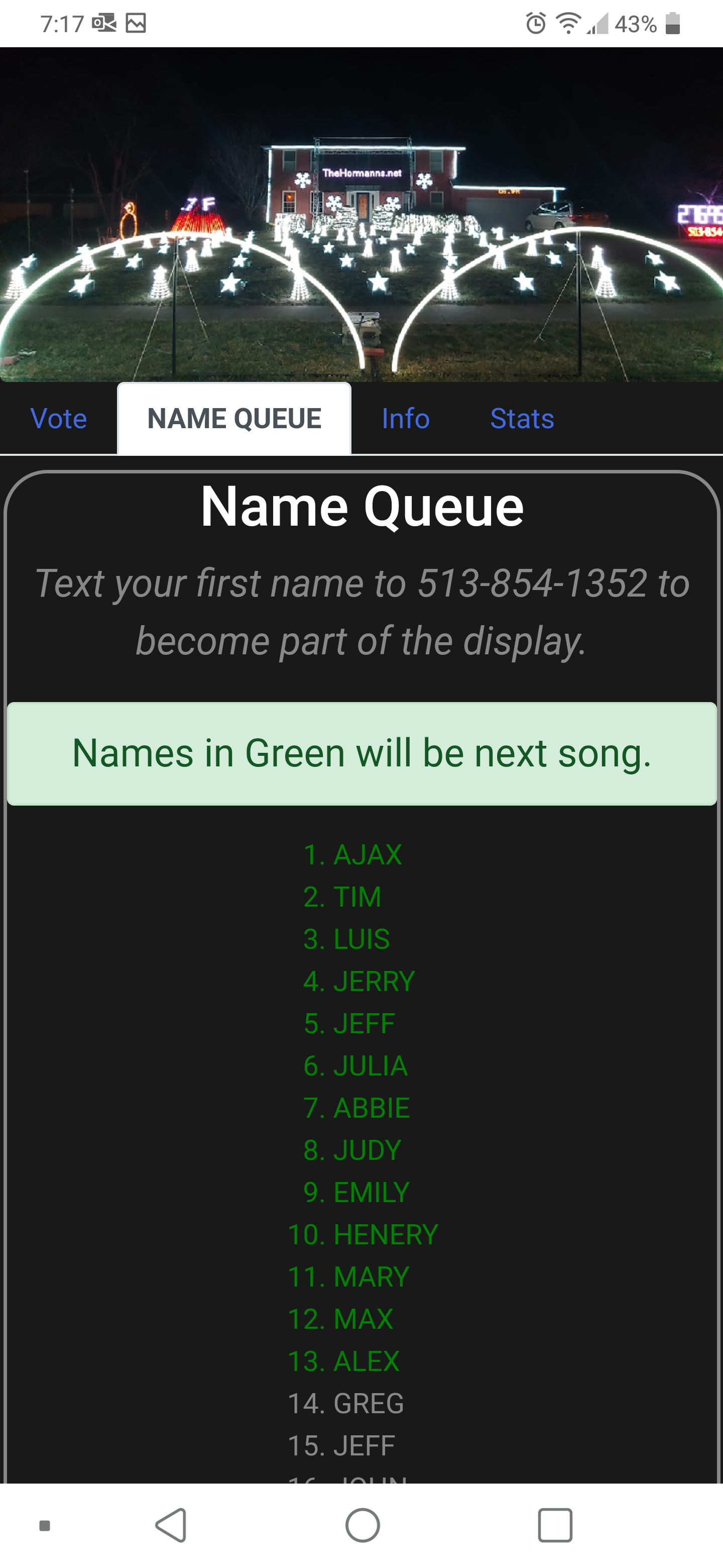 The text your name feature from 2018 worked so well that we wanted to add an additional interactive element in 2019. After some thought, we got the idea of allowing viewers to vote for the next song. After considering a few different implementations, we decided upon a simple website designed for the mobile phone — and that is how vote-now.org was born.